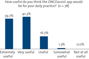 A total of 78 ESMO members were surveyed and the results were overwhelmingly positive. A total of 83% of those surveyed said ONCOassist would be ‘very useful’ or ‘extremely useful’ in their clinical practice (see Figure 1), while 59% said they would use it every day and 33% said they would use it once a week.
