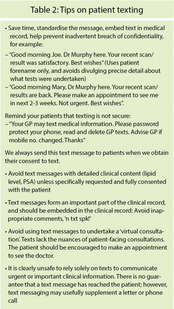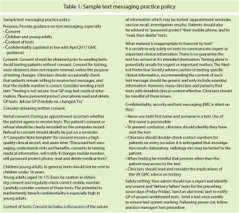 Text messaging is an important means of communicating with patients, with time management an important benefit. Clinicians should be mindful of the potential to breach confidentiality. Important issues to consider include consent, confidentiality, children/young adults and content. The GMC recognises that text messaging can be very convenient, once the inherent risks are recognised, understood and mitigated by both patients and clinicians.3 It is advisable to develop and implement a practice policy which addresses these important issues within your practice.