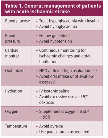 Any patient who has suffered a stroke should be managed and monitored in an appropriate setting, ie. a dedicated stroke unit or high-dependency bed. This facilitates more vigorous observation of their physiological parameters (see Table 1). The extent and intensity to which these parameters should be controlled is still somewhat contentious.