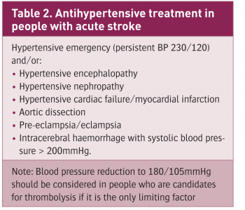 The current guidelines do not recommend blood pressure-lowering in patients with acute stroke unless levels are extremely high or thrombolysis is being considered (see Table 2). If rapid reduction is required then IV labetalol is an appropriate choice, with alternatives including IV isosorbide dinitrate or nicardipine. The recent SCAST trial which looked at the role of candesartan versus placebo in acute stroke concluded that clinicians should not prescribe blood pressure lowering agents in the first week of acute stroke.5 In patients already on antihypertensive medication, it is reasonable to continue them with close blood pressure observation.
