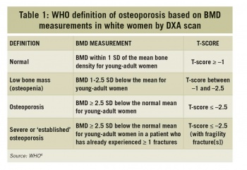 The WHO definitions of osteoporosis based on BMD measurements in white women are summarised in Table 1. For each standard deviation (SD) reduction in BMD, the relative fracture risk is increased 1.5-3 times.