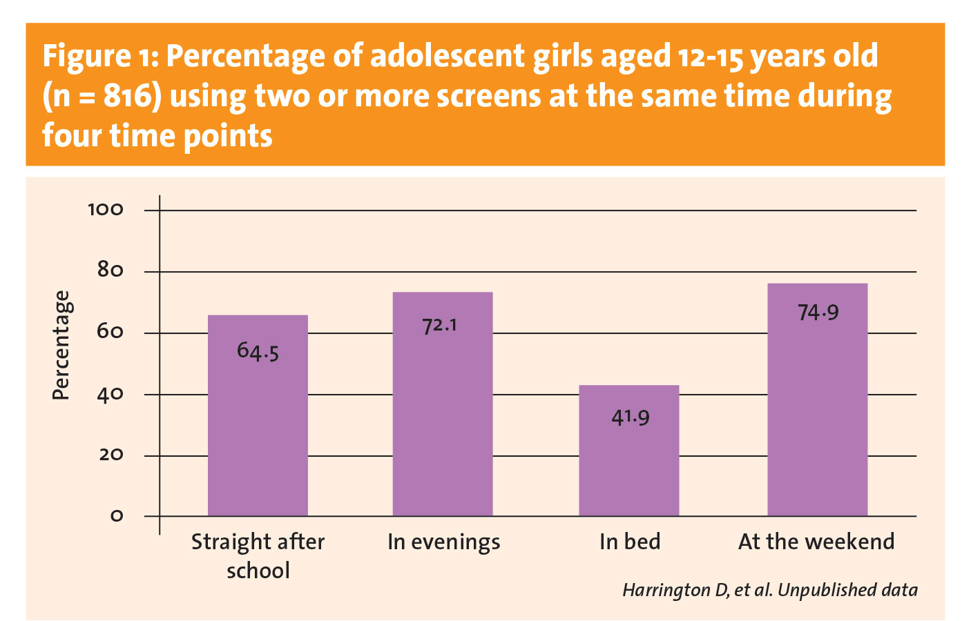 A common refrain from parents when asked about their child’s physical activity is “I can never get them off their screens”.13 The challenge is real. An Irish study found that a group of adolescent girls spent over 18 hours each day sitting or lying down.14 In a sample of adolescent girls in the UK, it was found that the majority use two or more screens at the same time (‘screen stacking’) across the day (see Figure 1).