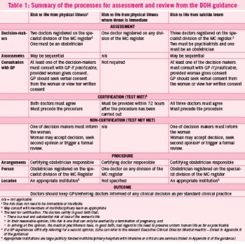 Referral pathways are described for physical and psychiatric risks. One of the doctors on the assessment panel must consult the GP ‘if practicable’, only if the woman consents. A GP is advised to seek verbal consent from the woman to provide information or see her written consent. There is a statutory duty on doctors (including GPs) to provide documents or appear before the review panel, if requested to do so. The framework is summarised in Table 1.