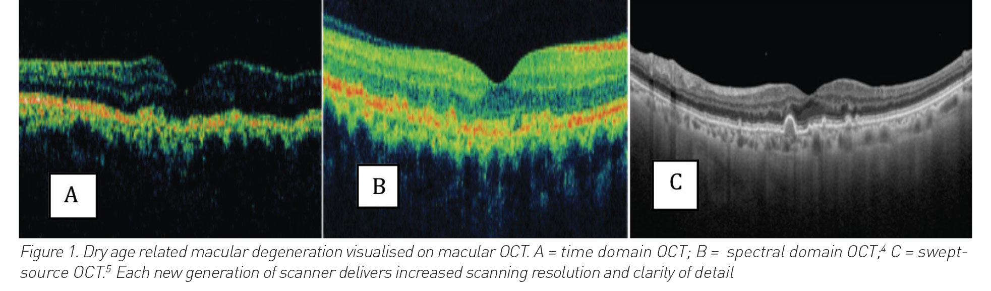 Swept-source OCT (SS-OCT) is the most advanced form of OCT. It represents the third generation of OCT development, following on from time-domain (TD) and spectral domain (SD) OCT (see Figure 1). SS-OCT differs from its predecessors by utilising a tuneable swept laser as the light source and a single photodiode as the detector. This allows it to operate faster, scanning wider and deeper images of the retina. The speed at which the SS-OCT functions has been groundbreaking, generating 100,000-400,000 A-scan images per second, which is double the speed of its spectral domain predecessor.3