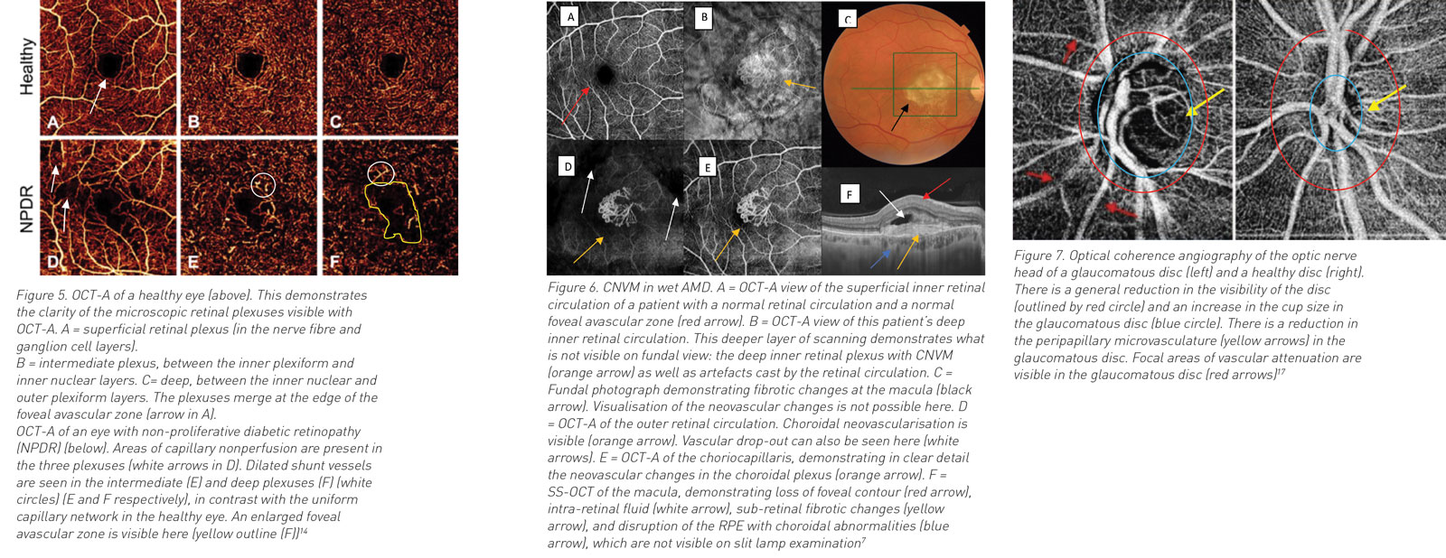 Furthermore, OCTA enables a different approach to visualising pathologies that were previously unseen on clinical examination and fluorescein angiography, such as occult choroidal neovascular membranes (see Figure 6)15 and vascular attenuation of the glaucomatous optic nerve (see Figure 7).16
