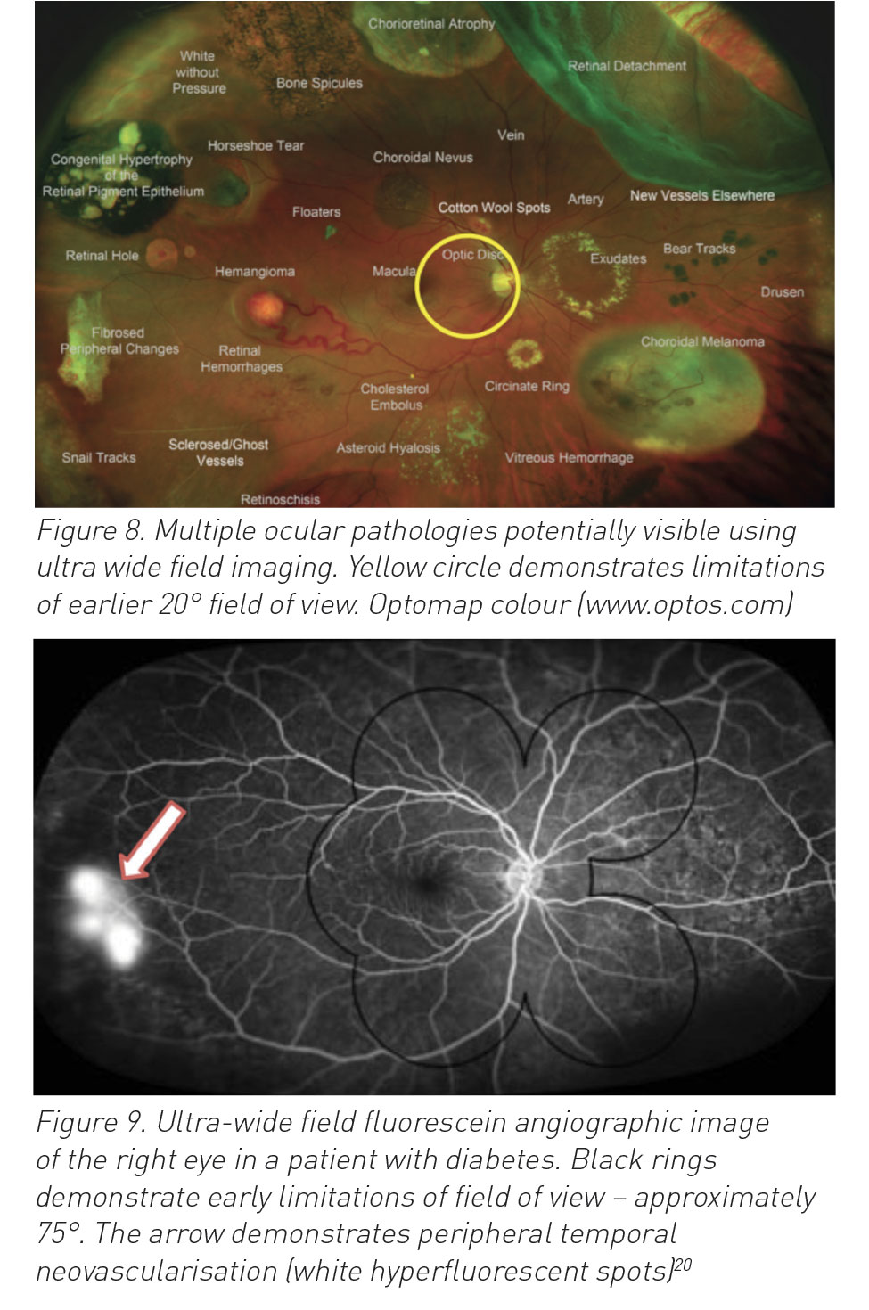 Imaging the fundus was made possible in 1926 by Zeiss and Nordensen when they created a fundal camera with a 20° field of capture. Essentially this captured a small area and was limited to viewing the disc, macula and posterior pole (yellow circle on Figure 8). Since then, we have witnessed an evolution into highly sophisticated non-contact scanning laser camera systems, such as the Optos camera capturing 200° ultra-wide field (UWF), high-resolution images, covering approximately 82% of the retinal area while retaining remarkable clarity.18 This has translated into outstanding diagnostic and prognostic capabilities for the treating ophthalmologist. Some potentially visible pathology seen using the Optos camera are displayed in Figure 8, in an overlay image of multiple possible ocular comorbidities.