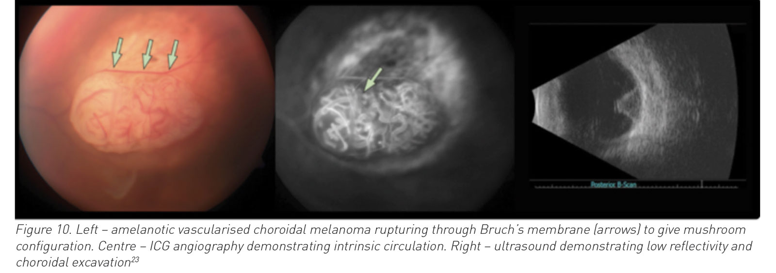 Furthermore, any vascular event such as retinal vein occlusions (RVO), arterial occlusions (RAO), retinal vasculitis and posterior uveitis, infer risk of ischaemia and subsequent neovascularisation leading to blindness.22 The management of many of these individuals now relies heavily on UWF imaging with FFA. Management in the form of appropriate sectoral, or pan retinal photocoagulation can help avoid secondary complications and preserve vision. Choroidal naevi or ocular tumours in the periphery can also be detected on UWF colour photography, (see Figure 8) and monitored for suspicious signs or progression indicative of malignant disease. Further imaging modalities in suspected tumours include ICG angiography to look for double circulation signs, and B-scan ultra sound scanning to assess degree of echoic reflectivity (see Figure 10).