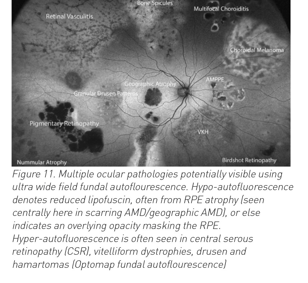 Fundal autofluorescence (FAF) is another non-invasive imaging modality, which essentially forms a lipofuscin density map and assesses the health of the retinal pigment epithelial layer (RPE), of particular use in dry forms of age-related macular degeneration. Lipofuscin, being the predominant fluorophore of the RPE, absorbs and emits light at a specific wavelength and has been in use for retinal photography since the 1980s.24 Its use is expanding but includes pathologies such as macular dystrophies, retinitis pigmentosa, white dot syndrome and drug toxicities. UWF FAF has also been shown to help in the management of rhegmatogenous retinal detachments25 and also to detect distinct peripheral abnormalities often seen in age-related macular degeneration.26