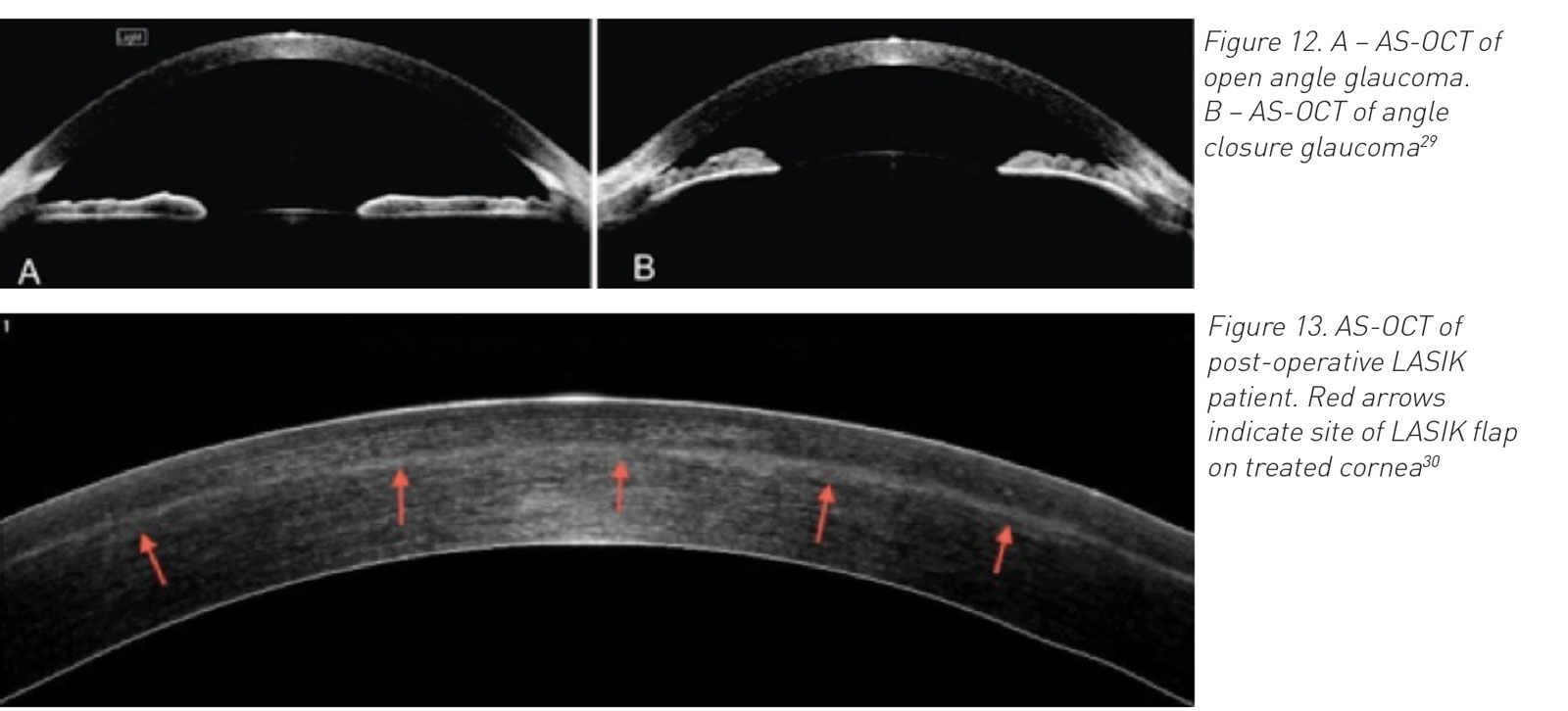 The development of anterior segment OCT (AS-OCT) has enabled significant imaging of the anatomy of the anterior ocular segment. It operates at 1310nm wavelength to acquire superior images of the conjunctiva, cornea, iris, anterior chamber and its angles, including the trabecular meshwork and Schlemm’s canal.27 These were previously only visible clinically through gonioscopy lenses, held in contact with the patient’s globe. Before the development of AS-OCT, there was no technology enabling imaging of the angle of the eye. This imaging is now integral in the diagnosis and follow up of serious conditions, such as acute angle closure glaucoma28(see Figure 12).