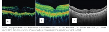 Furthermore, SS-OCT enables deeper visualisation of pathology under the retina and under the retina pigment epithelium (RPE), pathology that was previously not visible on the earlier versions of TD and SD OCT. This ability is especially relevant in macular diseases such as age-related macular degeneration (AMD) where pathological blood vessels may lie under the RPE (see Figure 3).