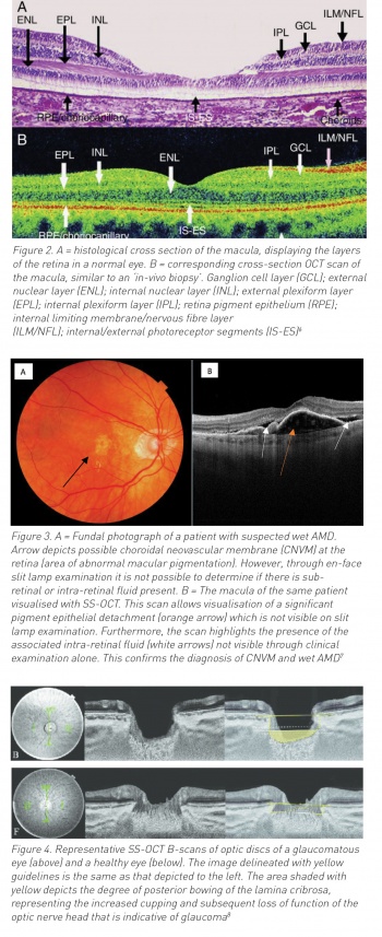 SS-OCT technology has additionally contributed to the understanding of other common eye diseases such as glaucoma where it can be utilised to monitor glaucoma progression through measurement of the depth of the retinal nerve fibre layer and ganglion cell layer of the retina, in slices that are less than 3µm thick (see Figure 4).