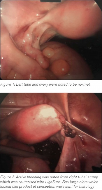 After arrival in theatre routine three-port laparoscopy was done with entry via umbilical incision using Verres needle. Abdomen contained a copious amount of blood, which was suctioned rapidly. The left tube and ovary were noted to be normal.