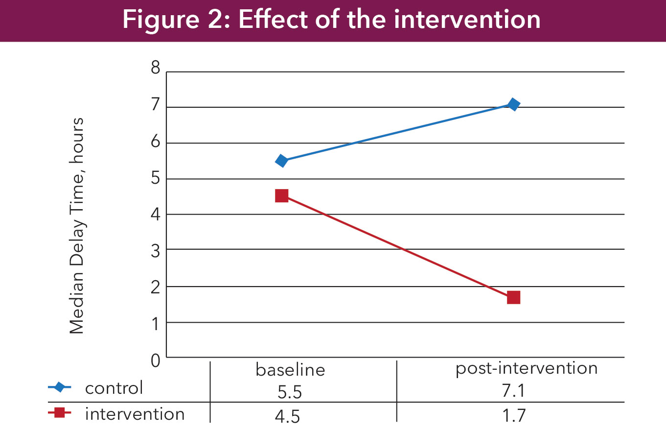 The post-intervention median pre-hospital delay time for the control group increased from 5.5 hours (at baseline) to 7.1 hours [25th percentile 2.7, 75th percentile 16.7]. These post-intervention readmission pre-hospital delay times represent an increase of 1.6 hours in the control group and a reduction of 2.8 hours in the intervention group, with a difference of 5.4 hours between the groups. The intervention was therefore very effective in reducing pre-hospital delay time.