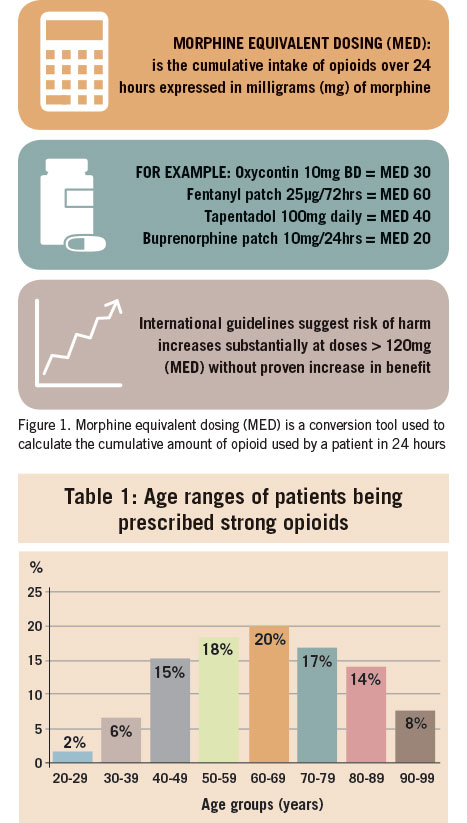 Internationally, a marked increase in opioid prescribing has coincided with a dramatic rise in opioid-related deaths and overdoses.1 Opioid analgesia can be effective for selected patients but evidence for its use in chronic non-cancer pain (CNCP) is lacking. American guidelines recommend that therapy should be maintained at low doses, defined as up to 40 morphine equivalent dosing (MED).2 MED is a conversion tool used to calculate the cumulative amount of opioid used by a patient in 24 hours.3 Higher MEDs, particularly those greater than 120, increase the risk of side-effects, overdose and death (see Figure 1).