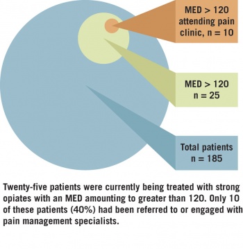Twenty-five (13%) patients were being treated with strong opioids with an MED in the ‘hazardous’ range (120 or greater); however only 10 of these had attended a pain clinic (see Table 2).