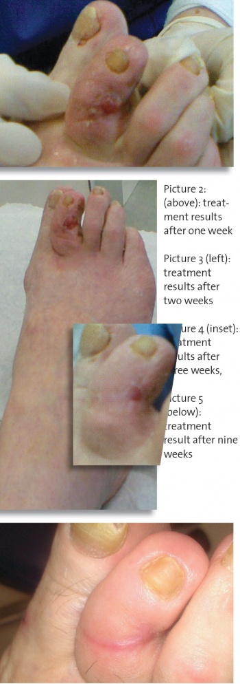 The evidence of infection, such as the digital oedema, began to resolve and the wound began to make some progress towards healing. The management regimen was continued without modification due to the success it was having and the progress seen initially was maintained in subsequent weeks (see Picture 3)