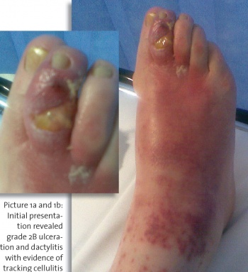 • Grade 2B ulceration6 (infected, non-ischaemic ulcer that penetrates to capsule or bone) to the dorsal aspect of the right 2nd toe overlying the distal inter-phalangeal joint (DIPJ) (see Picture 1a and 1b)