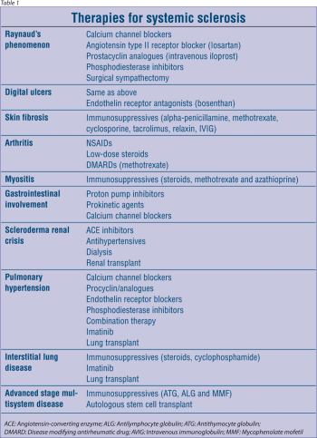 Although there is still no cure for SSc, studies on the pathogenesis of the disease are providing a growing number of molecular targets for potential therapeutic intervention. Treatment of SSc involves both non-pharmacological and pharmacological modalities. Therapy is directed at three compartments: the vascular system, the immune system and tissue fibrosis (see Table 1).