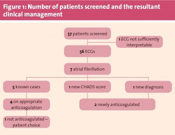 Of the 56 ECGs carried out, seven showed atrial fibrillation. On review of each patient’s clinical notes, five of these cases were already documented. Of the five known patients with atrial fibrillation, four were on appropriate anticoagulation.