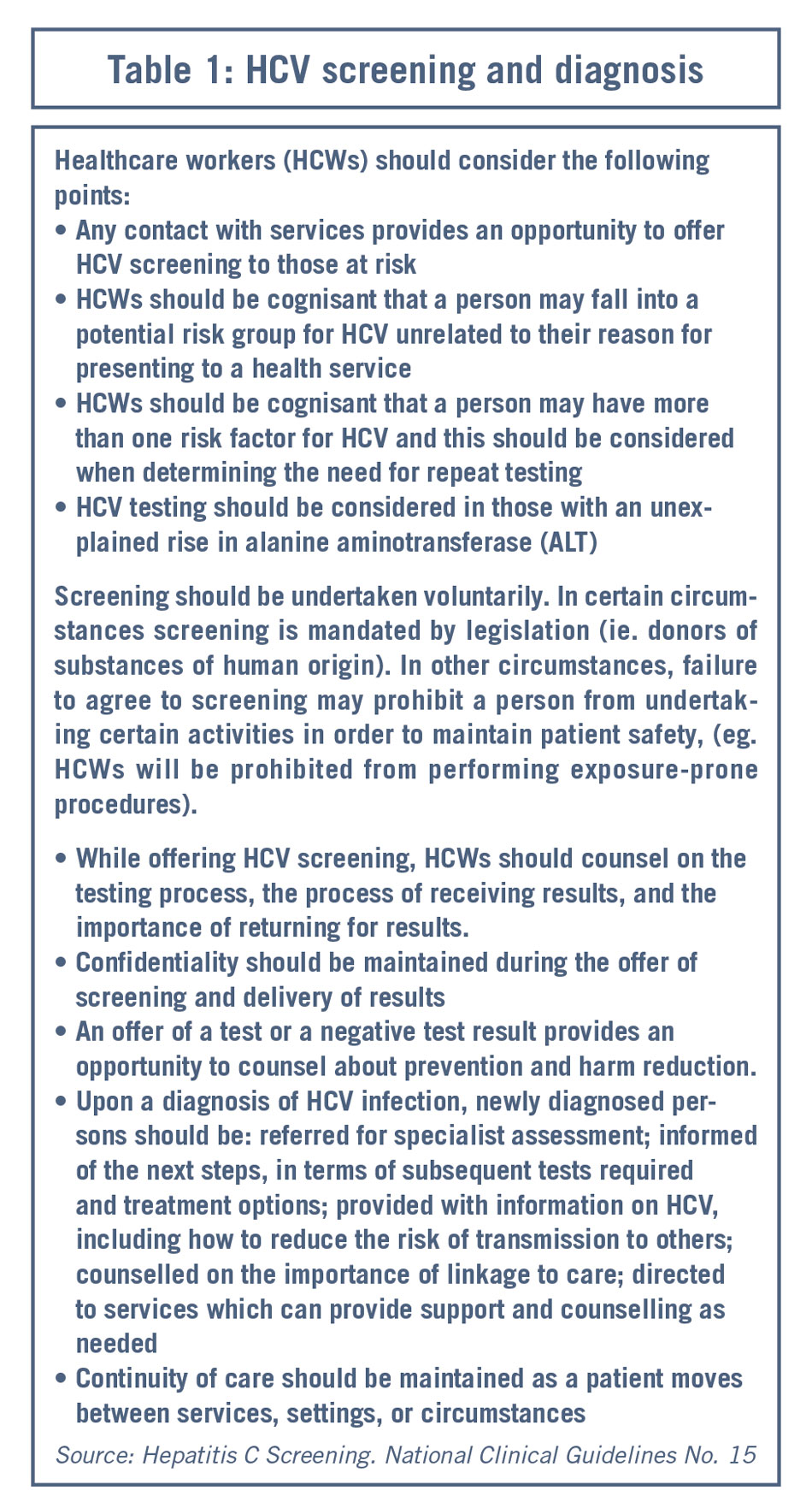 According to recently produced Irish guidelines on HCV screening,1 injecting drug use (IDU) is the major risk factor for HCV in developed countries such as Ireland. Initial infection with HCV is typically asymptomatic or mildly symptomatic. The most common symptoms are loss of appetite, abdominal discomfort, nausea/vomiting, and jaundice. Infection is rarely detected in the acute phase. Between 15%-45% of those infected clear the virus spontaneously, while the remaining 55%-85% of those infected develop chronic HCV infection.