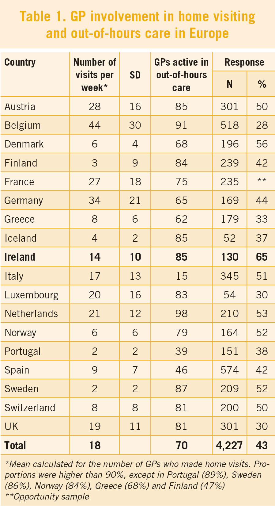 Cunney and O’Kelly9 reported a decrease in average home visiting rates of a Dublin inner-city practice with an approximate patient list of 7,000 and slight (57%) private patient predominance, from 45 per month in 2006 to 35 per month in 2010.