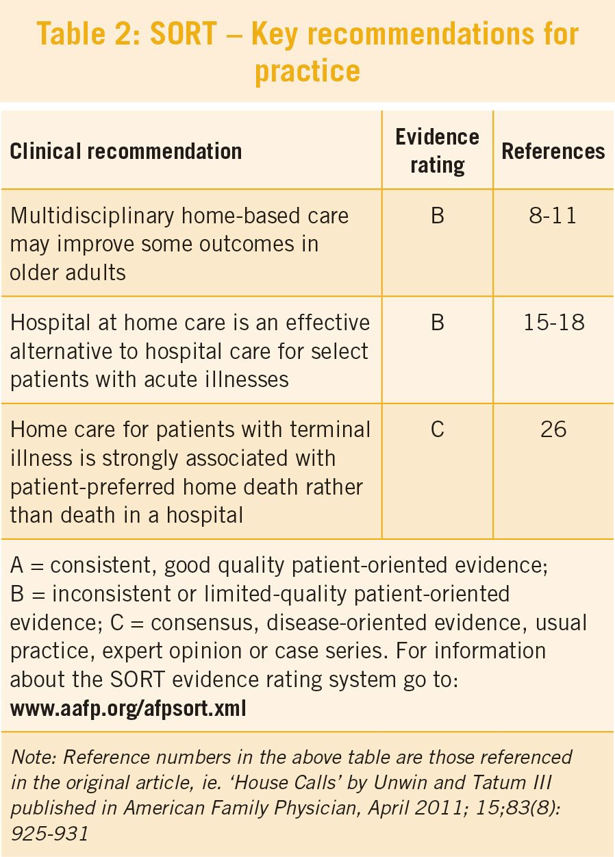However, Kao et al in their comprehensive 2009 review of the literature,19 unequivocally endorse home visiting as favourable and testify to the growing body of evidence demonstrating house calls as beneficial to a range of health outcomes including improved physical function, reduced nursing home use and hospitalisation, and even mortality in select cohorts.