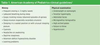 Chervin et al14 interviewed the parents of 866 children about their sleep behaviour. They specifically assessed the presence of attention/hyperactivity disorder. As many as 22% of habitual snorers reported attention deficit and/or hyperactivity compared to only 12% of non-snorers.14 Table 1 outlines the signs and symptoms highlighted by the American Academy of Pediatrics clinical guidelines.1