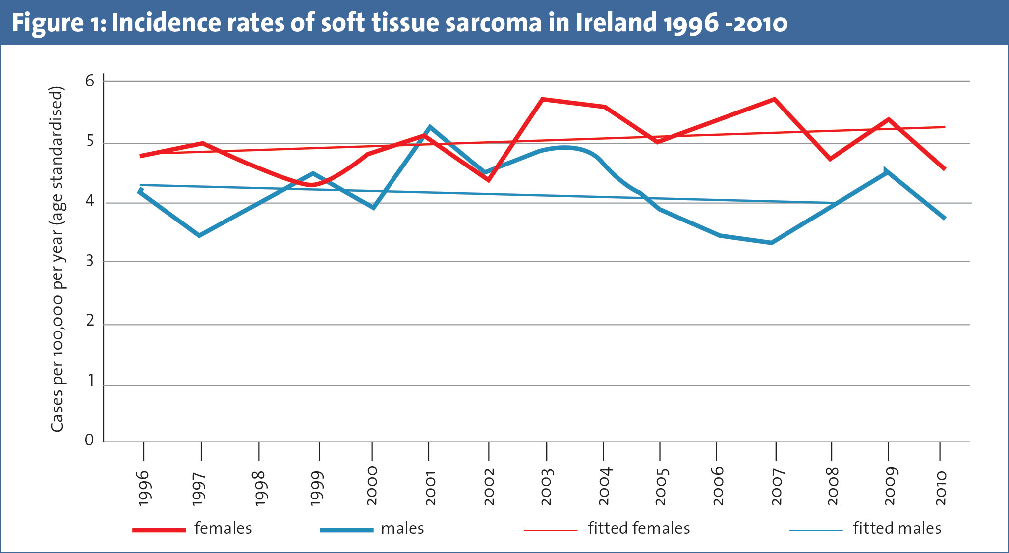 An average of 176 STS cases are diagnosed in Ireland every year.4 The age-adjusted incidence rate, as per a recent epidemiological report on STS in Ireland, is 4.48 per 100,000 person-years.4 This is at the higher end of the spectrum of published international incidence of STS: between 1.8 and 5.0 per 100,000 person-years. The incidence of STS in Ireland is comparable to the UK (4.25 per 100,000 person years) but lower than that in the US (5.03 per 100,000 person-years) and Northern, Central and Southern European regions (4.5-4.7 per 100,000 person-years). It is higher than Easter European countries (3.3 per 100,000 person-years)5 and certain individual European countries including Sweden (1.8 per 100,000 person-years), Austria (2.4 per 100, 000 person-years), Denmark (3.2 per 100,000 person-years), and Switzerland (3.6 per 100,000 person years).6