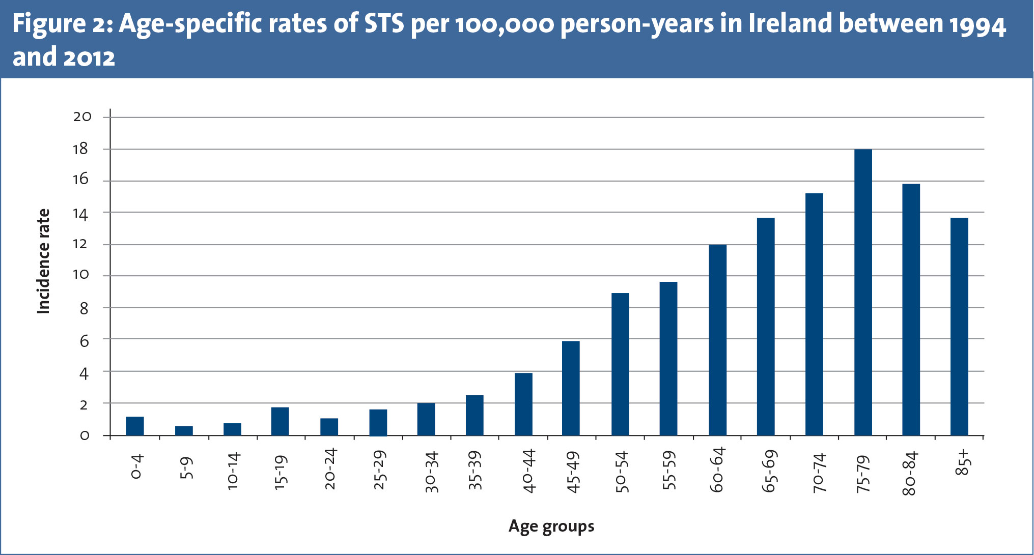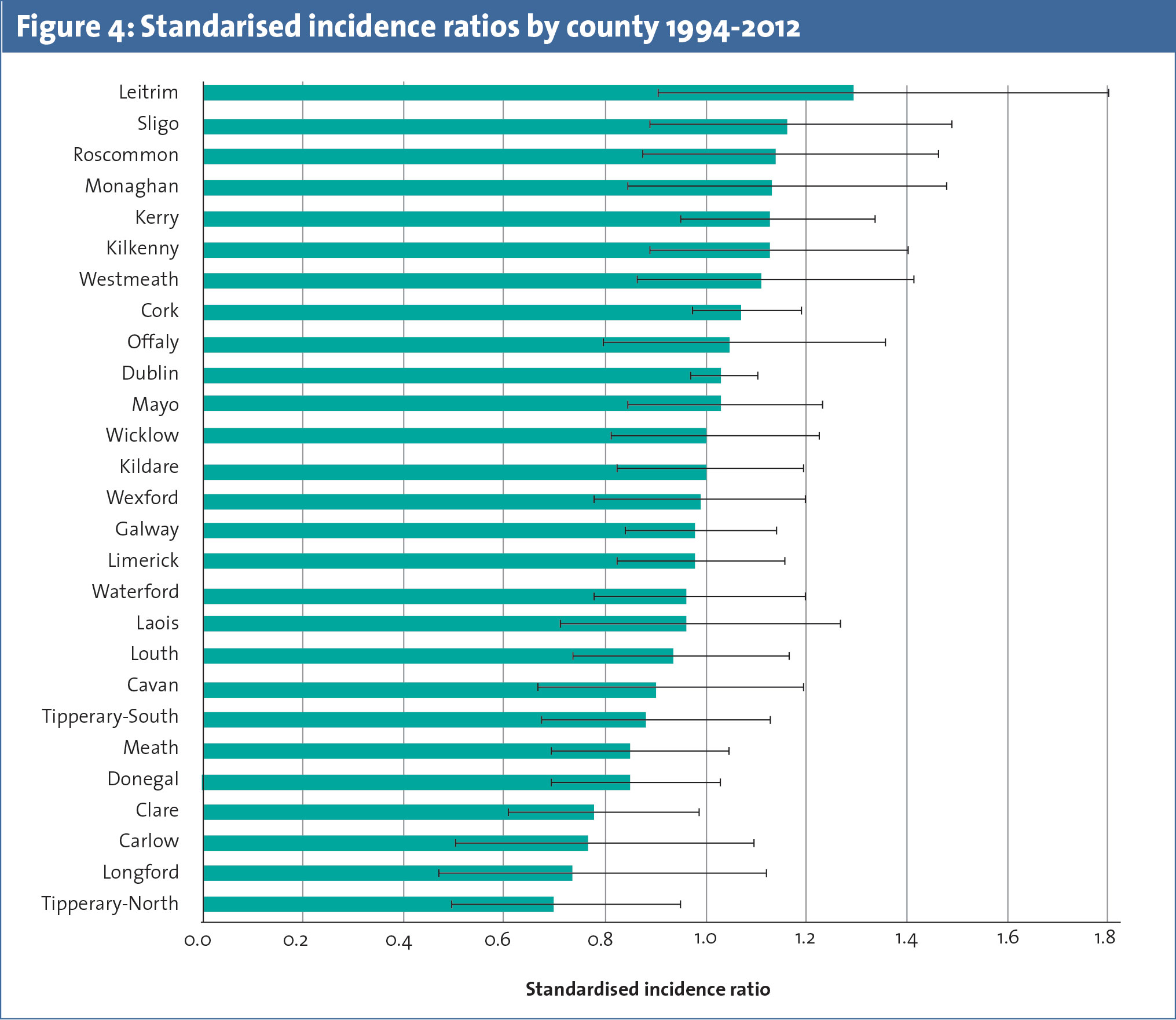 Geographically, the incidence of STS in Ireland varies across different counties but this is not significant statistically (see Figure 4). The age adjusted incidence rates are highest in county Leitrim and lowest in Longford in Ireland.4 There is no definite explanation for the current variation in incidence across geographical regions in Ireland. The interpretation of these differences must be done with caution due to relatively small absolute numbers of STS in each county.