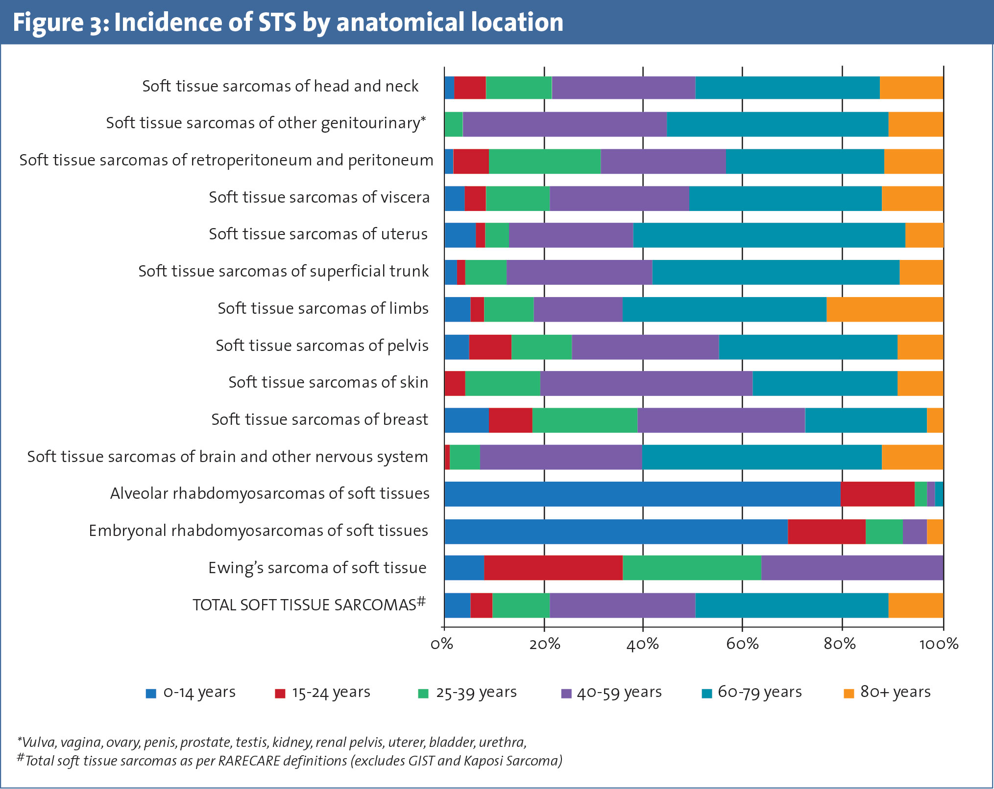 STS can arise from virtually any anatomical site but most frequently they arise in the limbs with approximately two-thirds of these arising in the legs and buttocks. The other common sites include uterus (16%) and skin (10%).4 As a proportion of invasive cancers, 85% of all soft tissue tumours arising from limbs and 75% of all cardiac tumours are sarcomas.8 They are not as frequent in other anatomical sites, representing less than 0.5% of all cancers in breast, skin and other visceral sites.