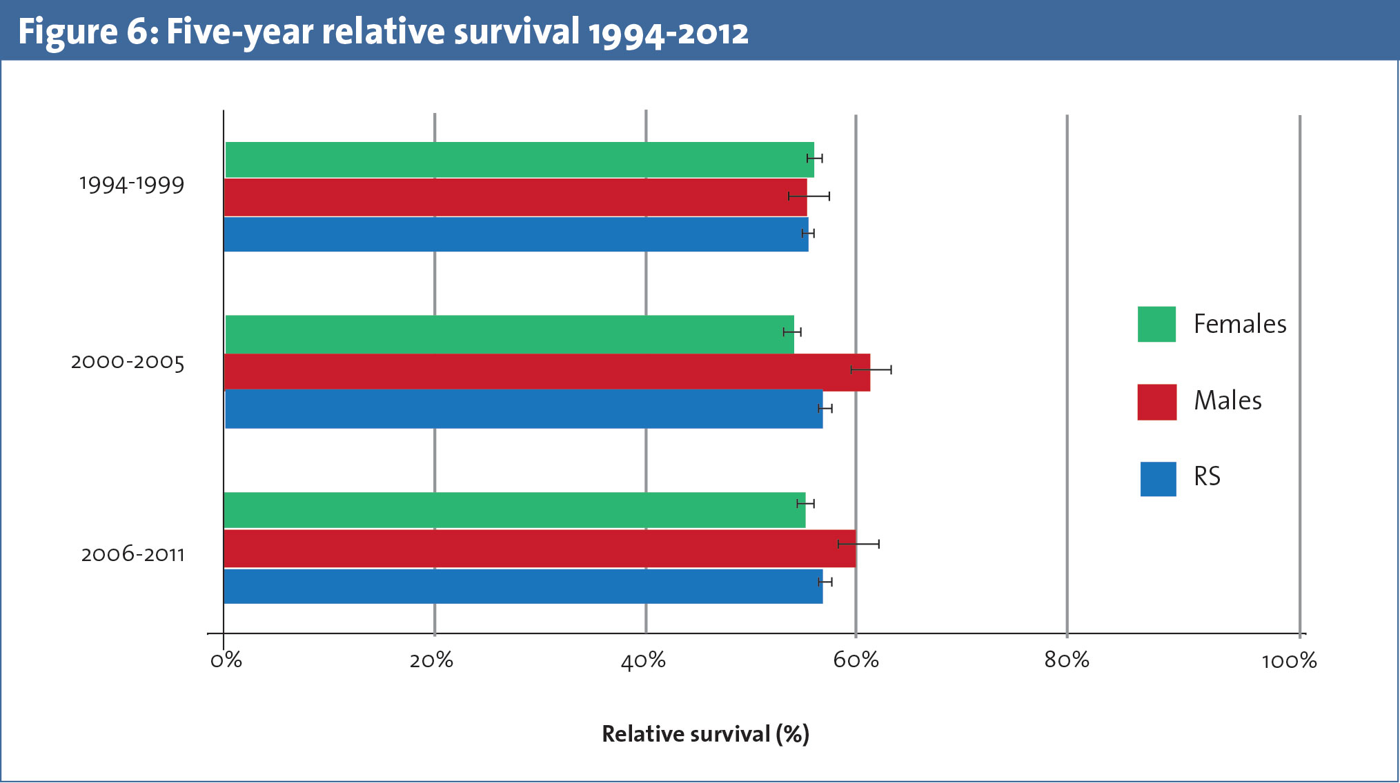 Survival rates of STS in Ireland (see Figure 6) are slightly lower than the European average but comparable to those in the UK (56%) and Eastern Europe. The overall five-year relative survival rates of soft tissue sarcomas increased between 1994-1999 and 2001-2005 from 55.1% to 57.1% in Ireland. This is statistically similar when compared to five-year relative survival rates in the UK (54% in 1995-2000 and 56% in 2001-2005).10 These observations are subject to differences in coding between UK and Ireland.