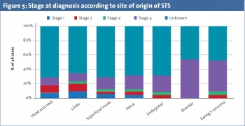 Tumour staging is performed in only 14% of STS cases diagnosed in Ireland with the largest proportion of tumours staged at diagnosis belonging to the stage IV group (see Figure 5). STS in limbs have a tendency to be diagnosed earlier than others.