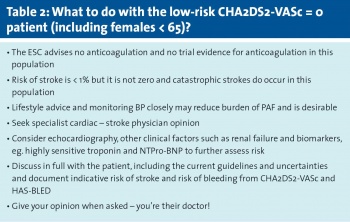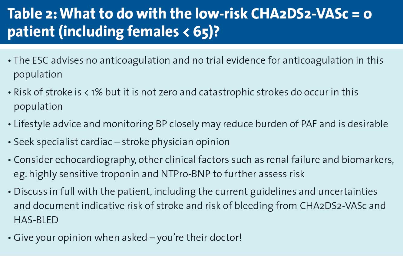 It is important to document the discussion in all cases with an indicative risk of stroke and bleeding explained to patients together with an explanation of the lack of individual certainty in this group with available risk scores. This will usually in my experience prompt a patient to ask your advice. That is after all why patients are consulting you and not Google. A pragmatic approach to the ‘low risk’ (CHA2DS2-VASc = 0 male or 1 [female sex only]) patient is suggested in Table 2.