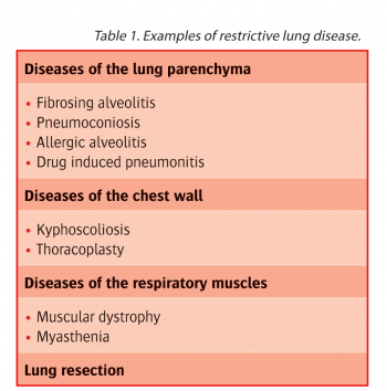 In restrictive diseases (see Table 1) VC is reduced by a reduction in TLC – ie. from the ‘top down’. In obstructive diseases – asthma and COPD – TLC is normal or may even be increased, particularly when emphysema is present.