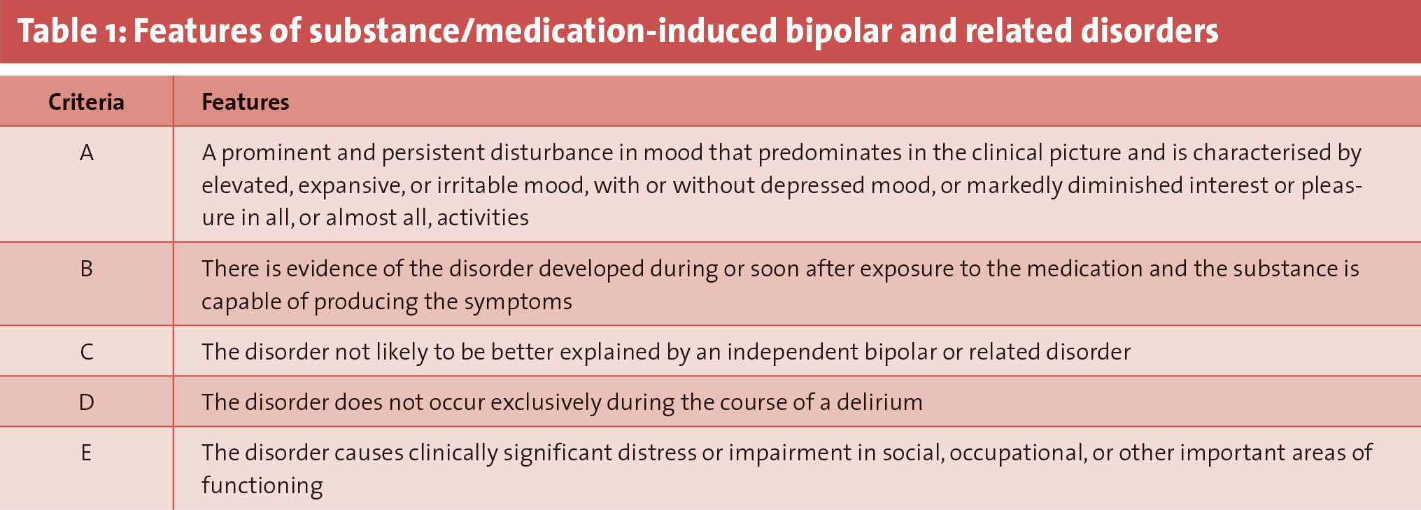 Steroid-induced mental disorder represents a range of symptoms from mild (anxiety, euphoria, emotional lability, irritability, insomnia) to severe (mania, psychosis, severe depression).2 Current evidence suggests mania is the most common psychiatric manifestation of steroid treatment.5 The Diagnostic and Statistical Manual of Mental Health Disorders, Fifth Edition, lists a number of criteria for the diagnosis of medication-induced bipolar and related disorders (see Table 1).6