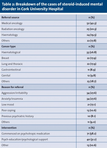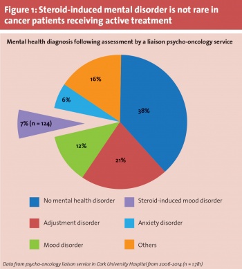 Data was collected from consecutive referrals of adult cancer patients to the Liaison Psychiatry team in Cork University Hospital (CUH), Ireland from 2006-2014 (n = 1781). Steroid-induced mental disorder was the third most common diagnosis (7%, n = 124), following adjustment disorder (21%) and other mood disorders (12%).