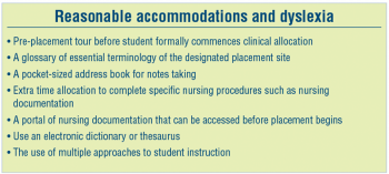 Reasonable accommodations provided to students with dyslexia have the potential to indirectly assist all students completing their practice placement. Every effort should be made to create portals for all students to access patient documentation, and construct unique abbreviation lists applicable to specialist and generic placements. In essence this is described as universal instructional design, where educational settings are striving to provide an accessible education for all students including those without dyslexia.17