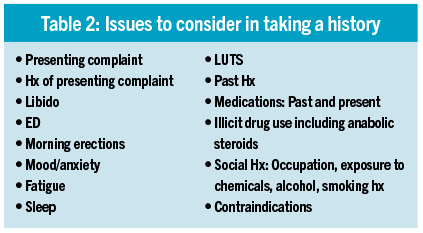 If a man presents with signs/symptoms of testosterone deficiency, a detailed history should be taken. This should include age, fertility concerns (exogenous testosterone reduces sperm production) and sexual history. The clinician must be satisfied that the patient is not seeking treatment for aesthetic purposes, such as bodybuilding (see Table 2).