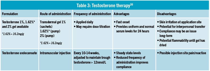 Patients should be evaluated at three, six, and 12 months initially (see Table 4) and then every 12 months thereafter to assess serum testosterone levels (therapeutic range 15-30nmol/L), confirm symptomatic improvement, and check for any changes in haematocrit and PSA levels. PSA increases of greater than 1.4ng/ml/year over a one-year period or a velocity of greater than 0.4ng/ml/year over two consecutive years warrants urological evaluation and three-monthly reviews. Haematocrit levels should remain below 54%. Dose adjustments or periodic venesection may be required to achieve this.
