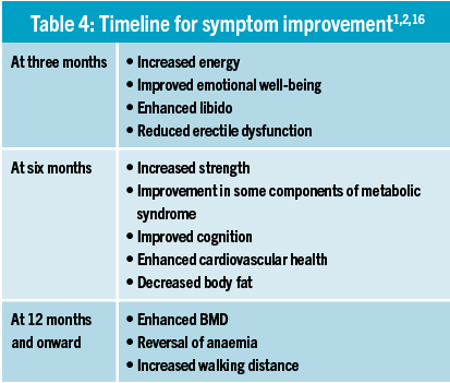 A trial of six months minimum to achieve maximal benefit is advised.19 If symptomatic improvement is not initially seen, prior to stopping therapy, testosterone levels should be checked. In one study it was found that despite treatment with testosterone for hypogonadism, participants had sub-therapeutic testosterone levels < 10.41nmol/L. Dose escalation or switching to a different agent can help as some patients absorb better than others.8 If the patient fails to see a benefit after this (and adherence if on gel application is assessed and not an issue) then discontinue treatment.