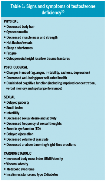 It is very important to screen high-risk groups for testosterone deficiency, These include men with erectile dysfunction, type 2 diabetes, a BMI > 30 or a waist circumference > 102cm, loss of libido or on medications such as antipsychotics, opioids or antiepileptics.