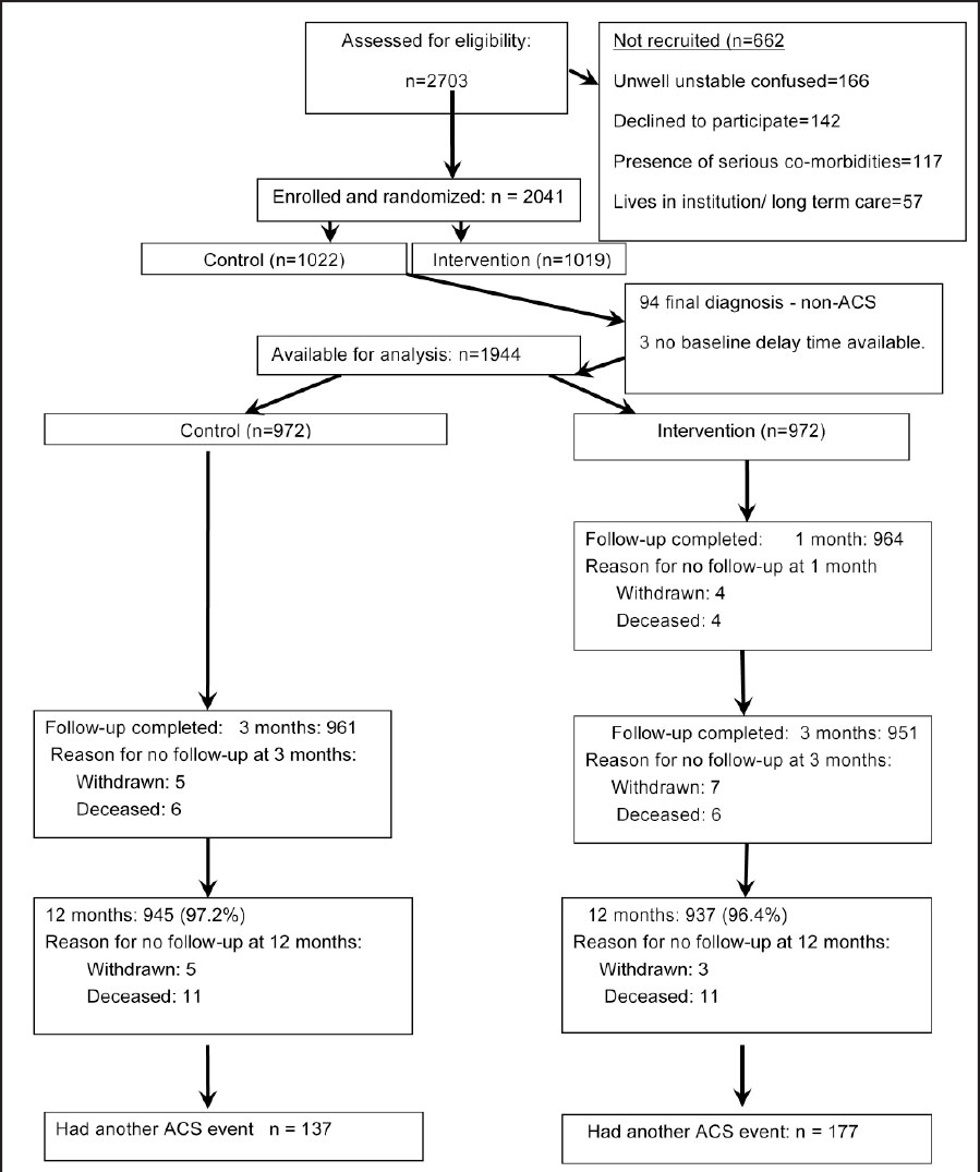 Of the 2,703 patients assessed for eligibility, 2,041 met the inclusion criteria and were enrolled and randomised (Figure 1, CONSORT diagram). There were 1,944 patients with a definitive diagnosis of ACS and a documented pre-hospital delay time (Figure 1). Of these, 972 were randomised to the control group and 972 to the intervention group. A total of 24 patients withdrew from the study and 38 patients (2%) died. Of those who died, 17 (1.75%) were from the control group and 21 (2.2%) were from the intervention group. Median baseline pre-hospital delay time for the total sample was 4.04 hours (25th percentile 1.63 hours and 75th percentile 18.16 hours). There was no difference in pre-hospital delay time between the control (median 4.28 [25th percentile, 1.71 and 75th percentile, 17.37] and intervention median 3.96 [25th percentile, 1.53 and 75th percentile, 18.51]) (Mann-Whitney U, p = 0.34) groups at baseline.