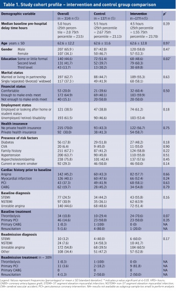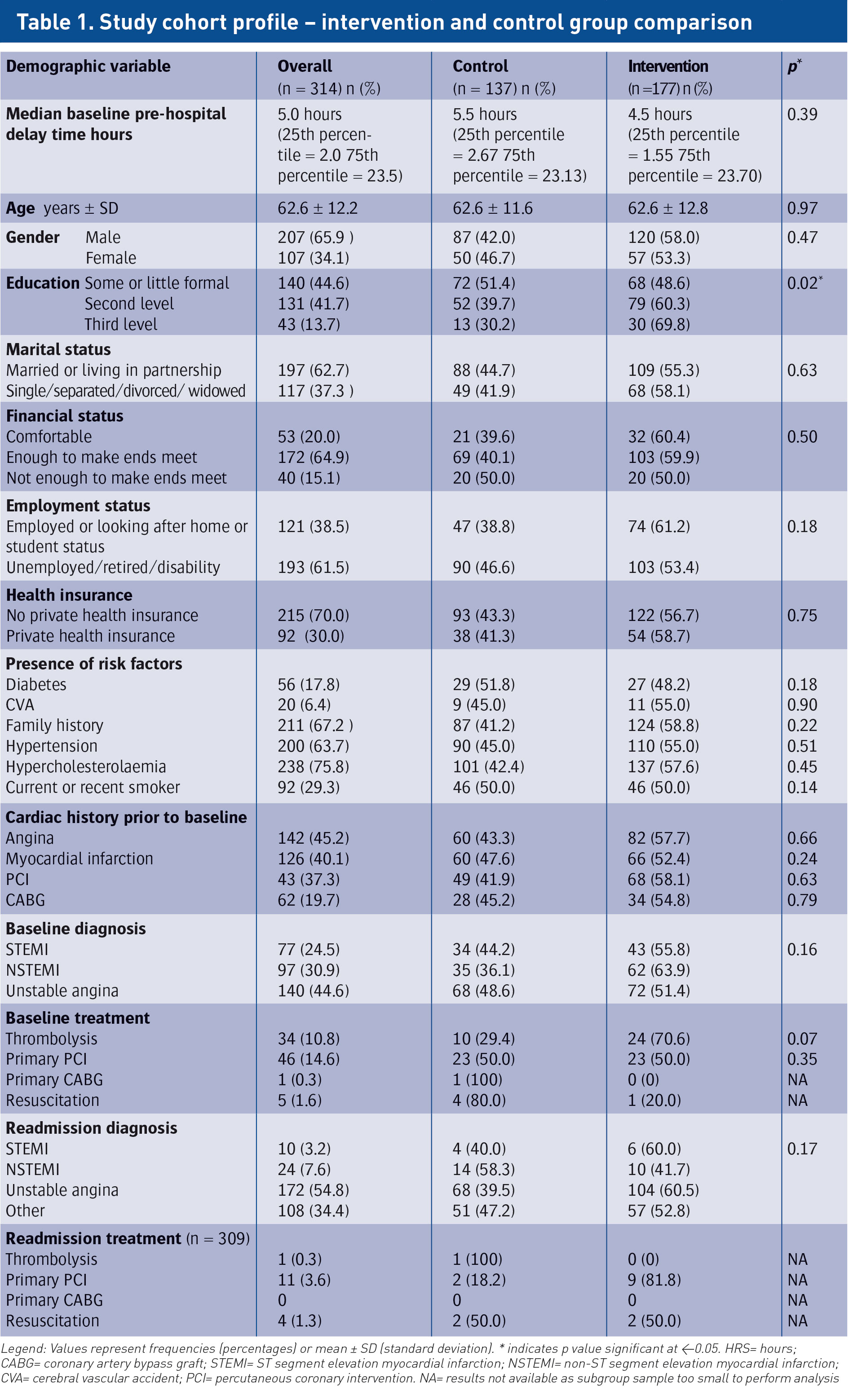 There were 314 (16.2%) patients readmitted to an ED with ACS symptoms. Of these, 137 (14.1%) were from the control group and 177 (18.2%) were from the intervention group (Figure 1). There was no significant difference between the two groups of patients who were readmitted with ACS symptoms with respect to baseline pre-hospital delay times (control median 5.5 hours [25th percentile, 2.67 and 75th percentile, 23.13] and intervention median 4.5 hours [25th percentile, 1.55 and 75th percentile, 23.70]) (Mann-Whitney U, p = 0.39). The only significant difference between the two groups readmitted with ACS symptoms was the level of education attained (p = 0.02) (Table 1).