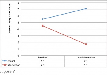 The two groups readmitted differed only with respect to education level (Table 1). Therefore, after controlling for education level, and using repeated measures ANOVA, we found that there was a significant post-intervention difference in pre-hospital delay times between the groups. Among the intervention group, the median pre-hospital delay time was reduced to 1.7 hours (25th percentile 1.1, 75th percentile 2.9) while the post-intervention median pre-hospital delay time for the control group readmitted increased to 7.1 hours (25th percentile 2.7, 75th percentile 16.7) (Figure 2). These post-intervention readmission pre-hospital delay times represent an increase of 1.6 hours in the control group and a reduction of 2.8 hours in the intervention group, with a difference of 5.4 hours between the groups. The change over time remained significantly different between the groups F (1,310) = 37.599, p = < 0.001. The primary study hypothesis was therefore accepted.