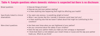 Where you suspect domestic violence but there is no disclosure, questions may initially be broad in focus or may be linked to specific clinical observations (see Table 4). Do not ask a patient about violence unless the patient is alone and you cannot be overheard.