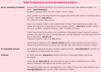 Referral, in the context of victims of domestic violence, is different from the standard referral process familiar to GPs. The approach when such a disclosure is made should be to empower the patient to undertake action that she deems appropriate at a time that she deems appropriate. It is helpful to signpost appropriate specialist services (see Table 5).