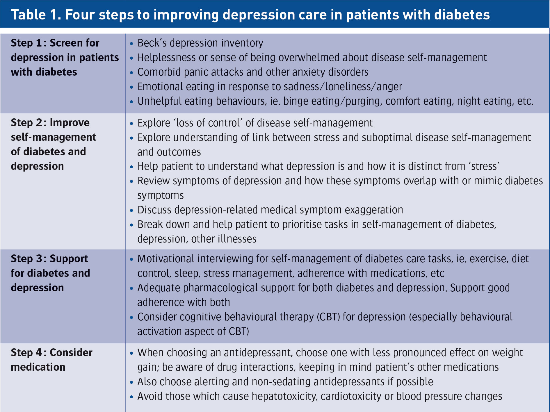There are four steps in improving depression care in patients with diabetes (see Table 1).