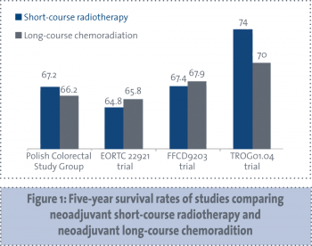 The Polish study indicated no difference between short-course radiotherapy and long-course chemoradiotherapy in overall survival rates (67.2% versus 66.2%) or disease-free status (58.4% versus 55.6%).3