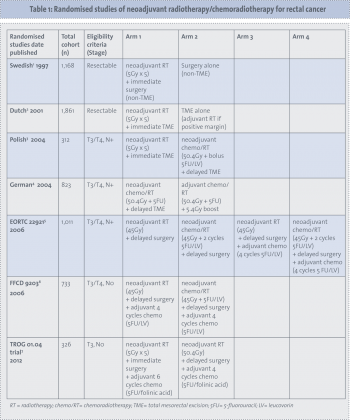 We reviewed randomised controlled trials assessing neoadjuvant treatment regimens of rectal cancer published between 1996-2012. These include the Swedish Rectal Cancer Trial, the Dutch trial, trials conducted by the Polish Colorectal Study Group, the German Rectal Cancer Study Group, the EORTC 22921, the FFCD 9203 and TROG 01.04 trials.