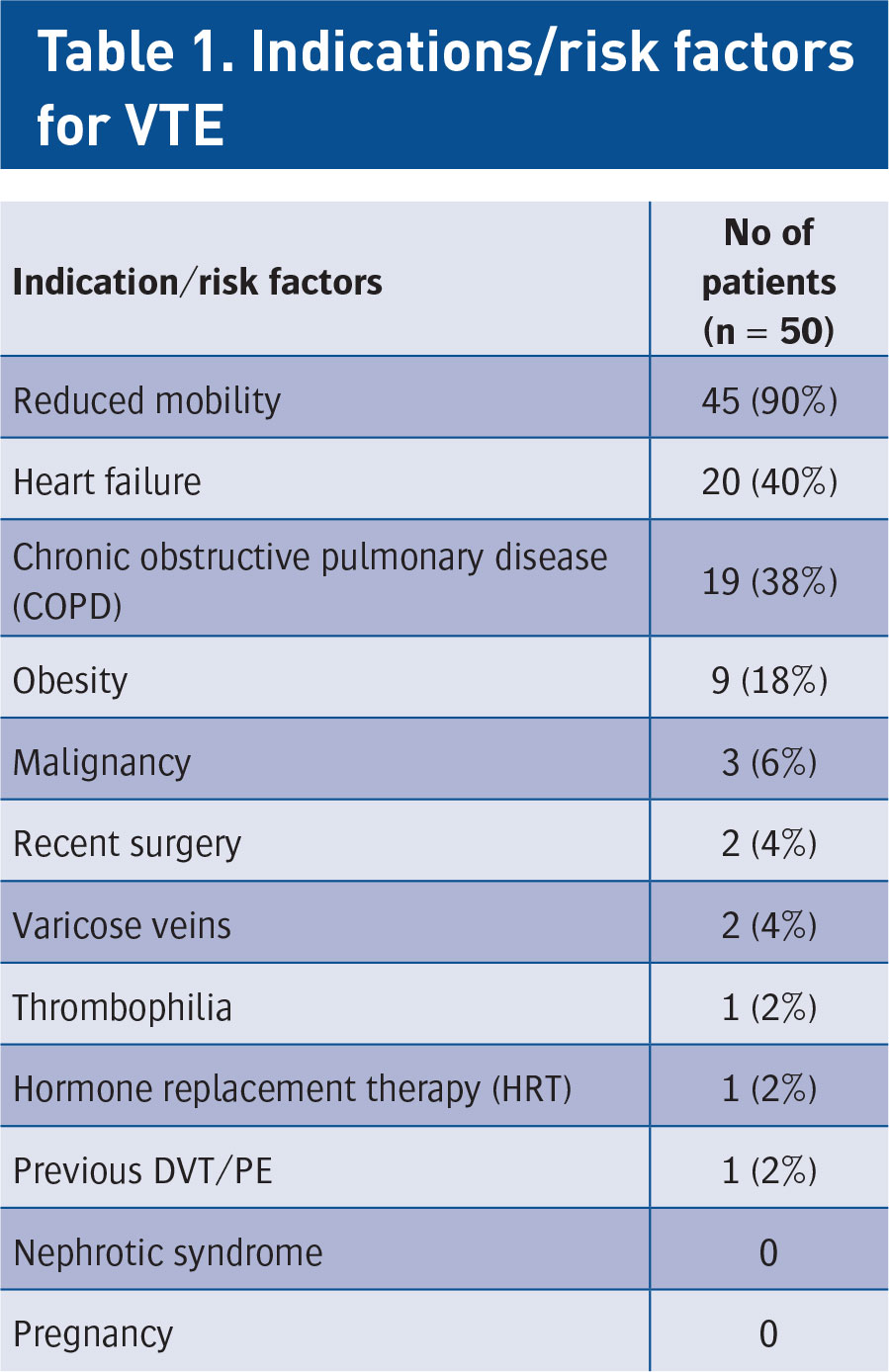 There were slightly more males (54%; 27) than females (46%; 23) in the study. The most common risk factor for thromboembolic phenomenon was found to be reduced mobility for more than three days, which was present in 90% (45) of patients. Risk factors are shown in Table 1. Most of the patients had more than two risk factors including: heart failure (present in 40% [20] of patients), chronic obstructive pulmonary disease (present in 38% (19) of patients), obesity in 18% (9) and malignancy in 8% (4) of patients. Other risk factors were recent surgery and varicose veins in 4% (2); thrombophilia and patients on hormone replacement therapy were found in only 2% (1) of patients.